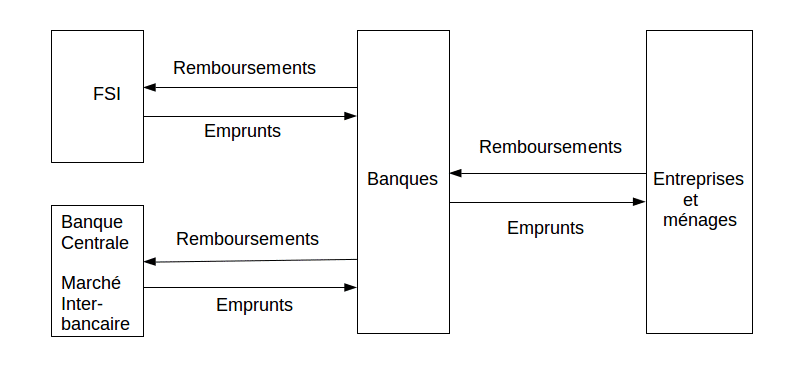 Le FSI pourra assurer la fonction de banque centrale auprès des banques ou cohabiter à côté d’une banque centrale. L’ensemble formé par le FSI, et les banques forme le système financier socialisé.